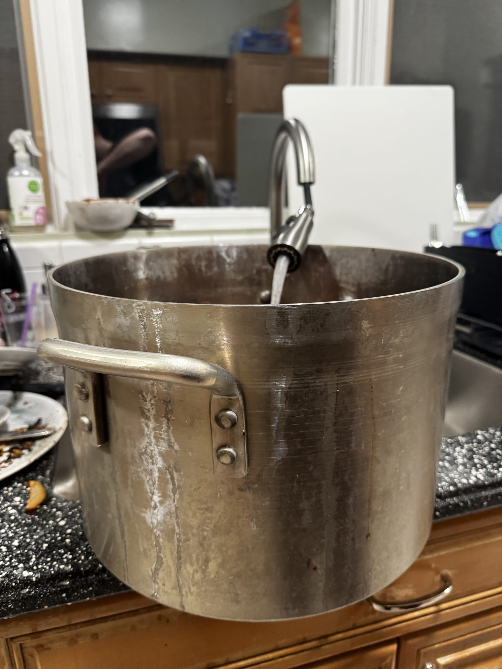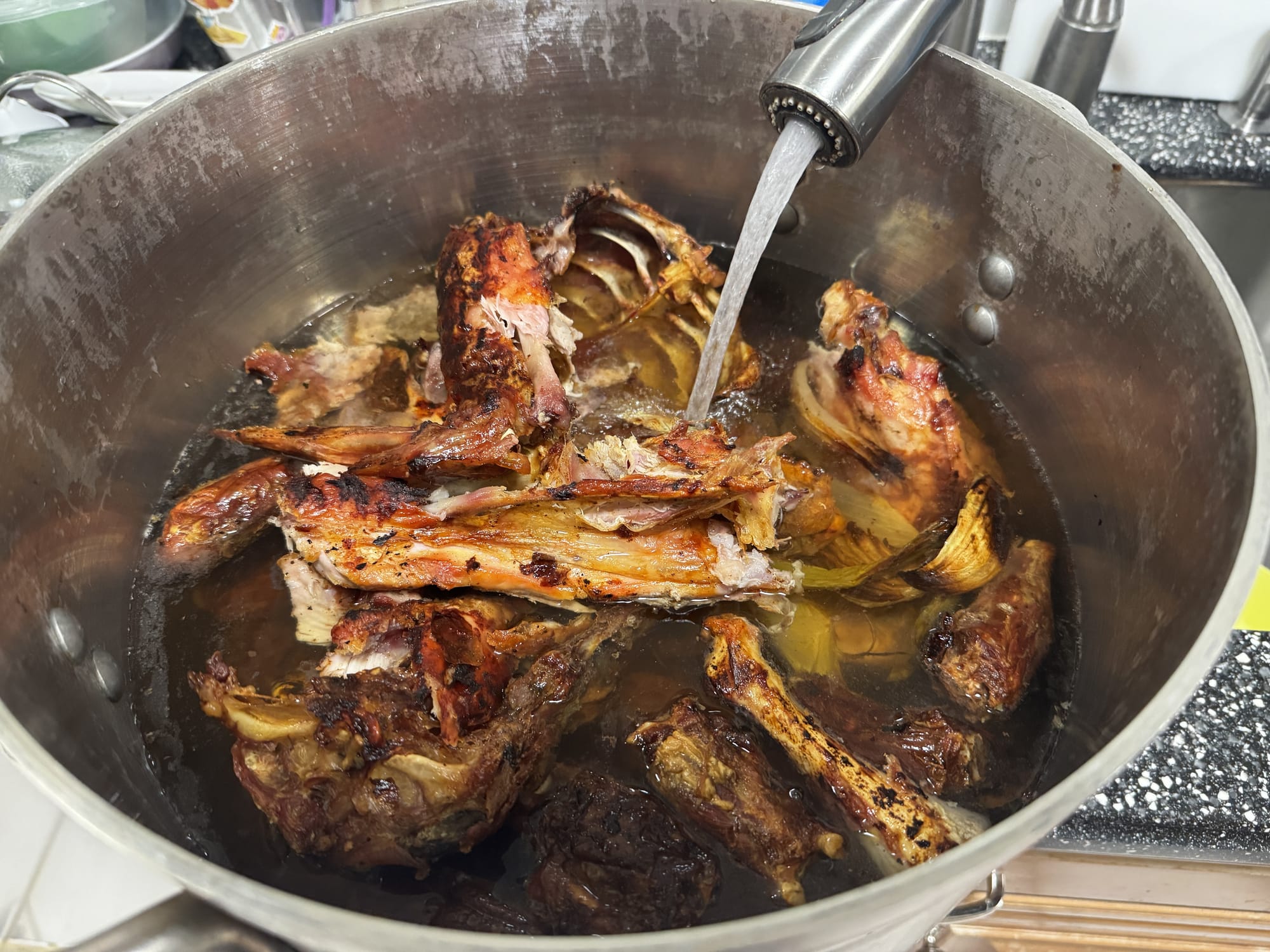 When the tomato paste is thinking about turning black, the oven gets a break. Throw everything in the stock pot and fill with COLD water. (Yes, it makes a difference.) If any of the onions seem too charred, toss 'em. You got what you needed from them during the roast. Then bring it up to a simmer slowly--almost even a sub-simmer. 200-205F is probably about right.